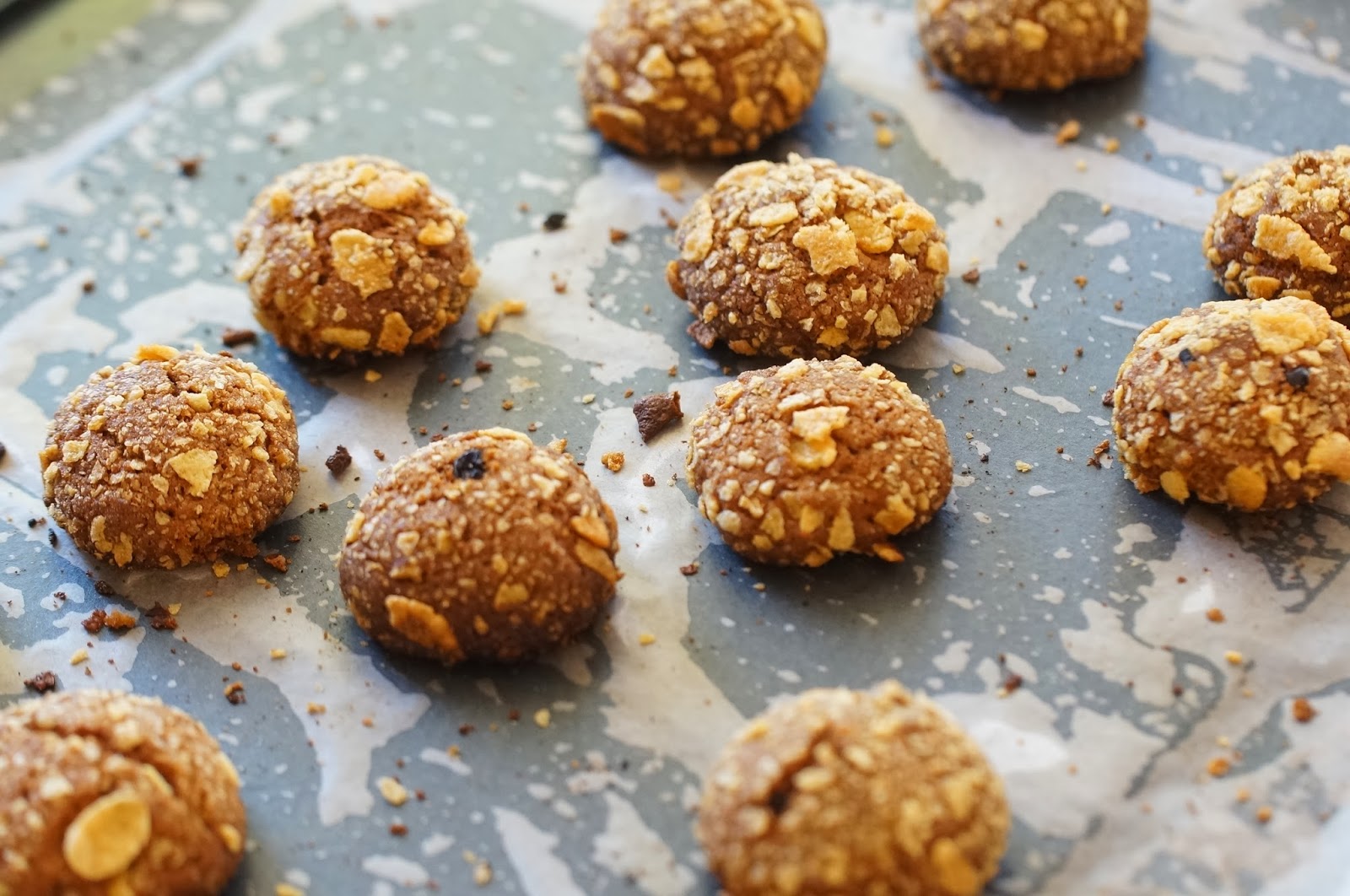 4. Roll the dough balls into the cornflakes and place on a lined baking tray about 1 1/2" apart.